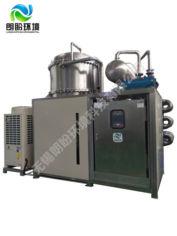 熱泵濃縮蒸發(fā)器的原理是物料的沸點隨著壓強的降低而降低。低溫節(jié)能濃縮設備整體保持真空狀態(tài),濃縮室的真空度約為95%~97%,在此壓強下水的沸點為35℃~37℃,系統(tǒng)無需配備進料泵,利用蒸發(fā)室的負壓將物料吸進蒸發(fā)室,通過強制循環(huán)方式將物料循環(huán)霧化,傳輸至換熱器上,物料中水分被蒸發(fā),物料連續(xù)循環(huán)霧化,通過蒸發(fā)室液位自動補料,濃度達到要求后作為濃縮液排出設備。濃縮液一般粘度較大,需采用泵抽出。